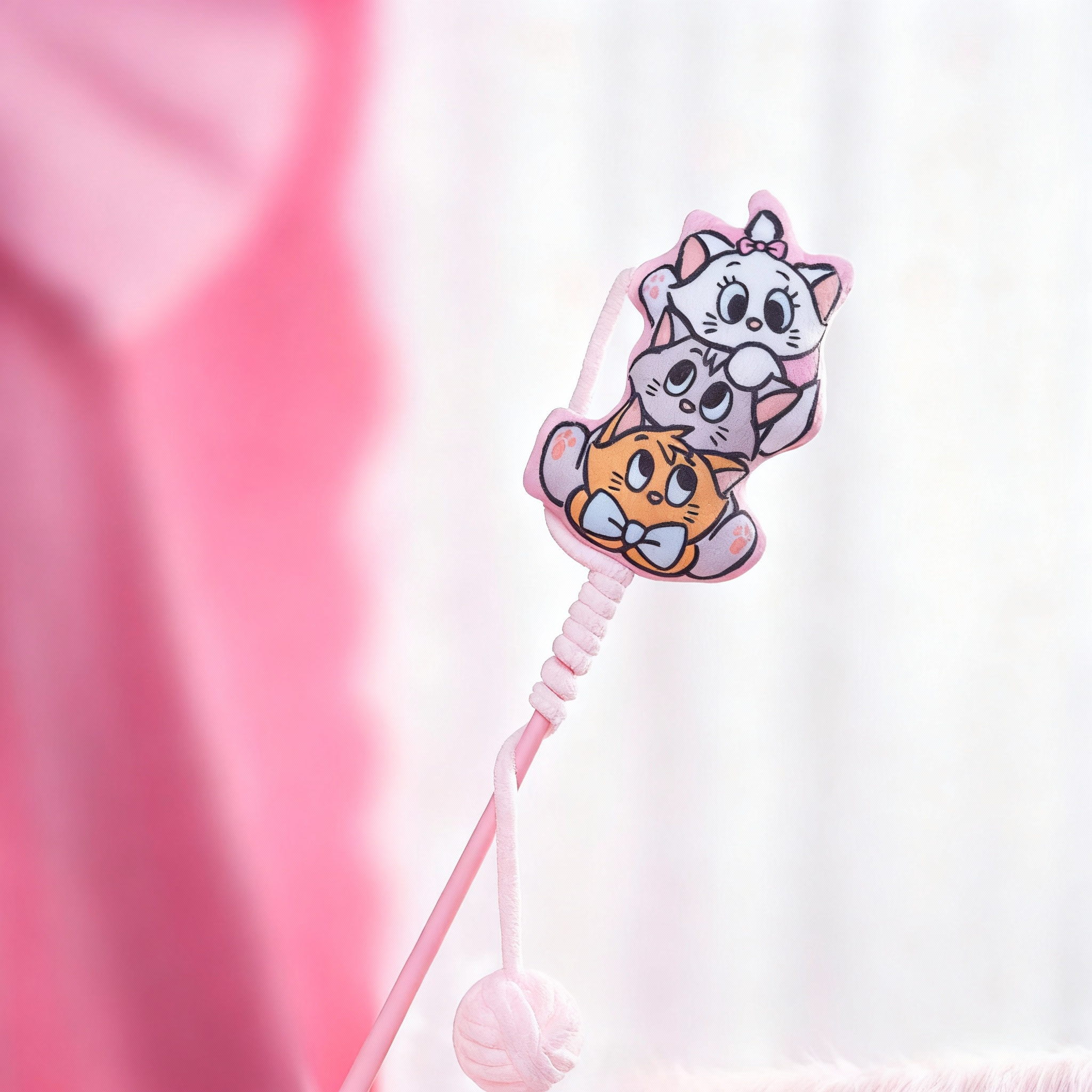 This cat teaser wand toy features a combination of crinkle paper, bell, catnip, and feather, designed for interactive play.