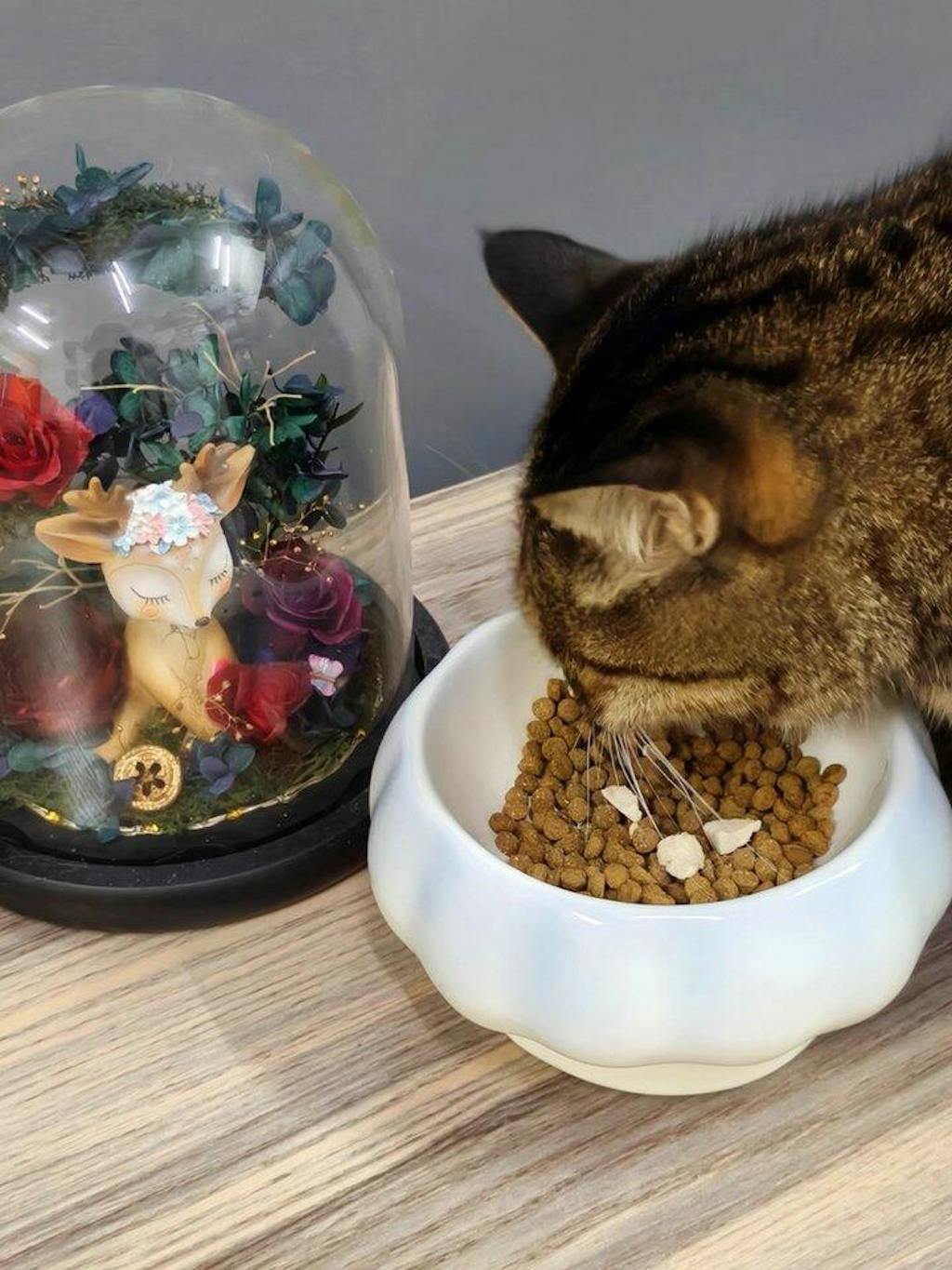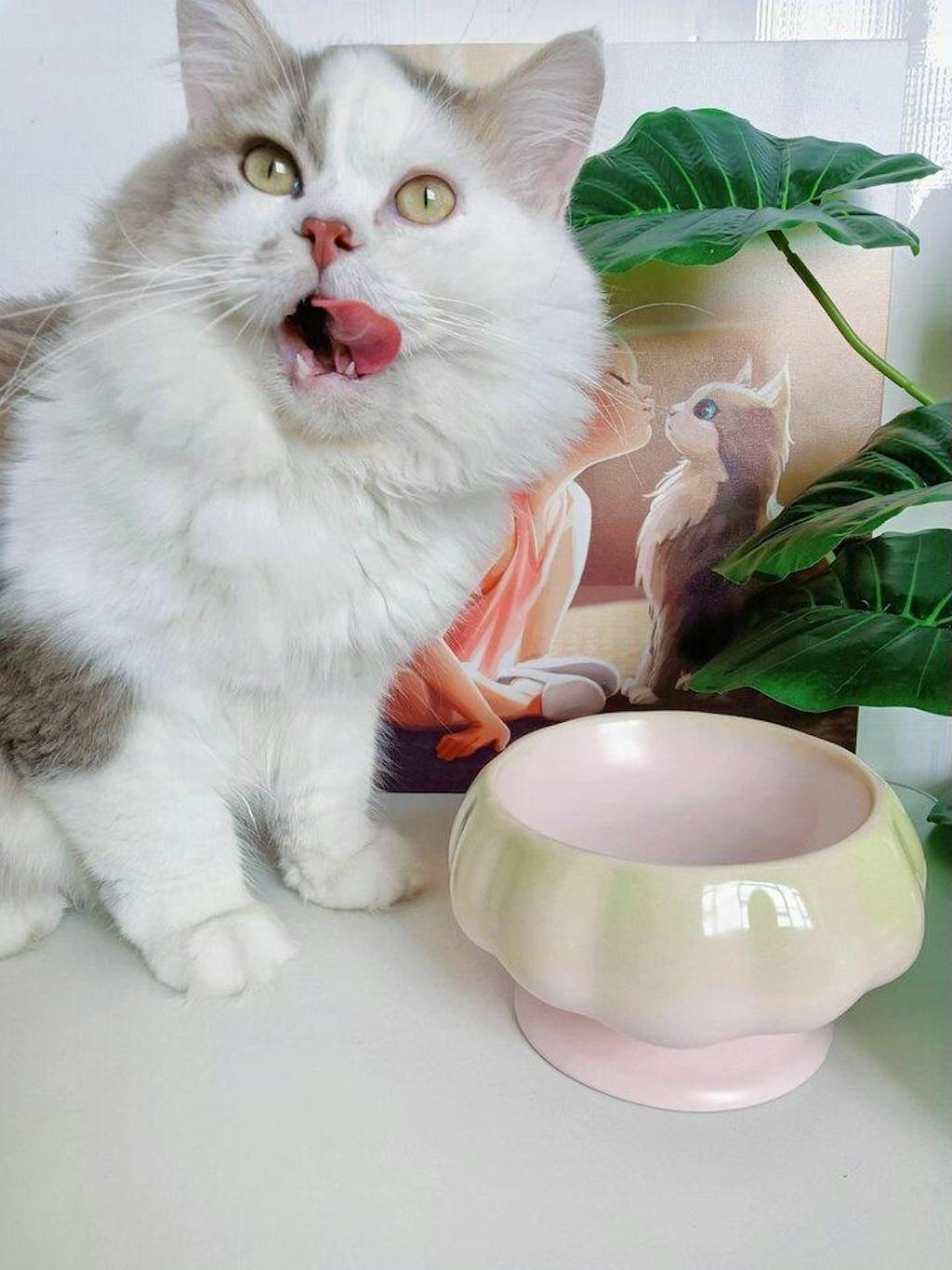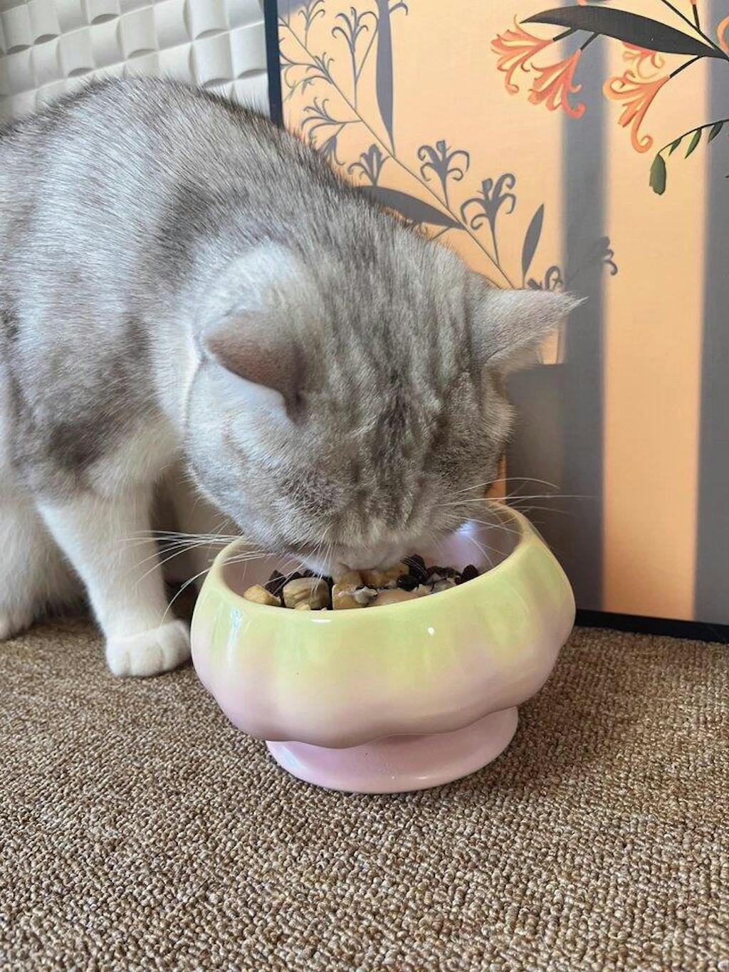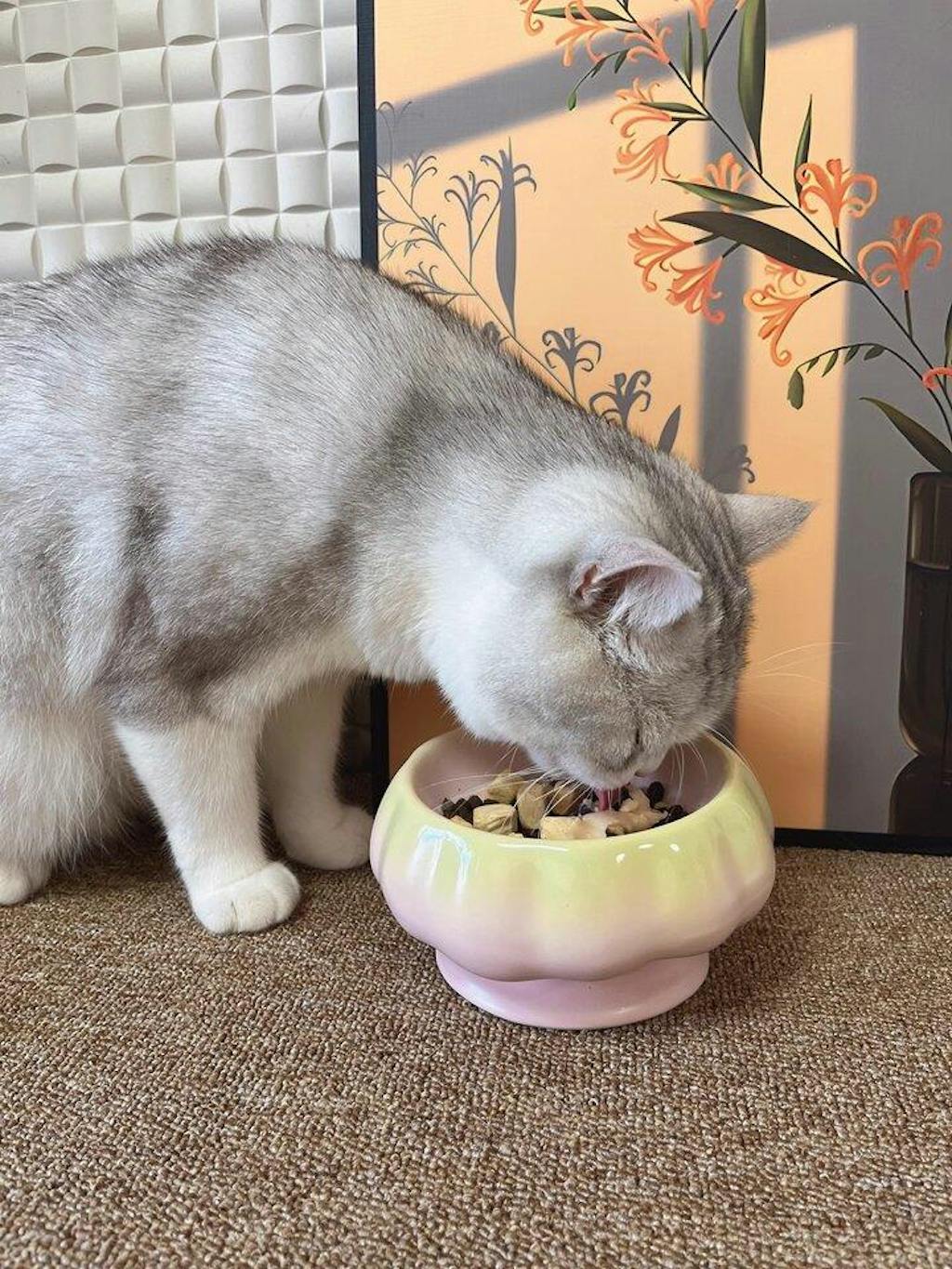 This ceramic cat bowl features a tilted design that helps cats maintain a more natural eating and drinking angle, reducing neck strain during daily use.