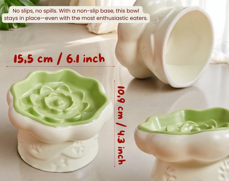 Enhance mealtime with our Flower-Shaped Ceramic Slow Feeder Elevated Pet Bowl (6.1 × 4.3" //15.5 × 10.9 cm). Its raised design and shallow, ribbed interior slow gulping, protect delicate whiskers, and promote healthier digestion for cats & small dogs. The sturdy non-slip base prevents sliding, while premium food-grade ceramic is microwave- and dishwasher-safe for effortless cleaning. Available in pastel green, pink, or red to match any décor.