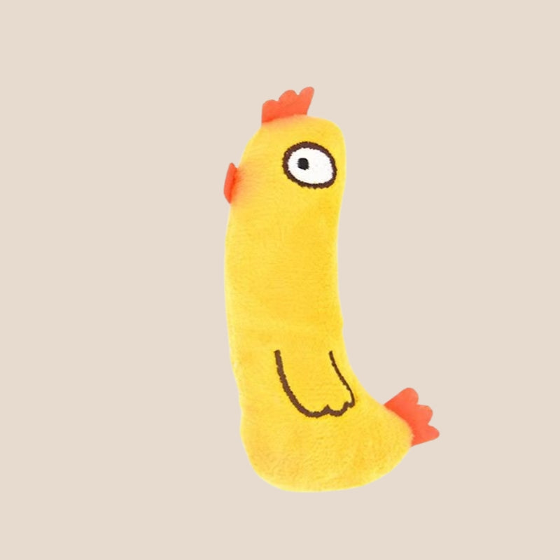 This plush cat toy is made with soft fabric and designed for cats to cuddle, bite, and play with.